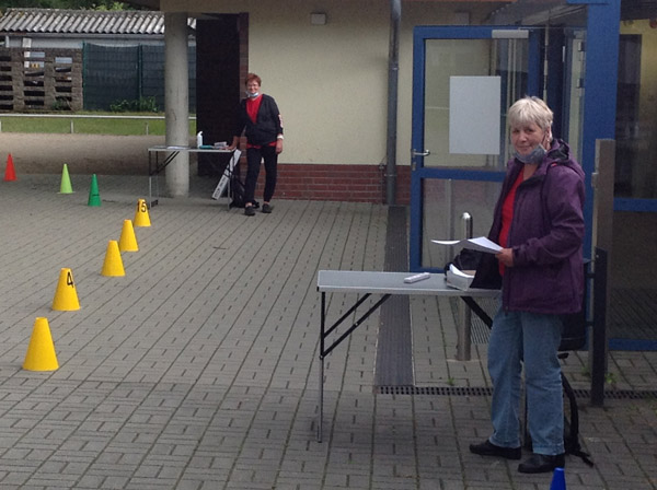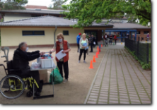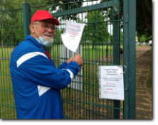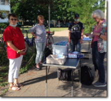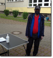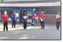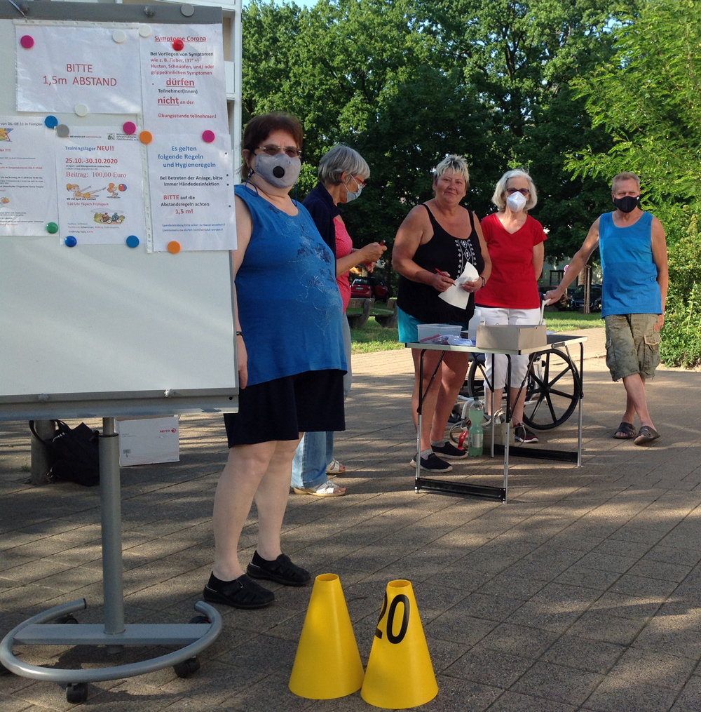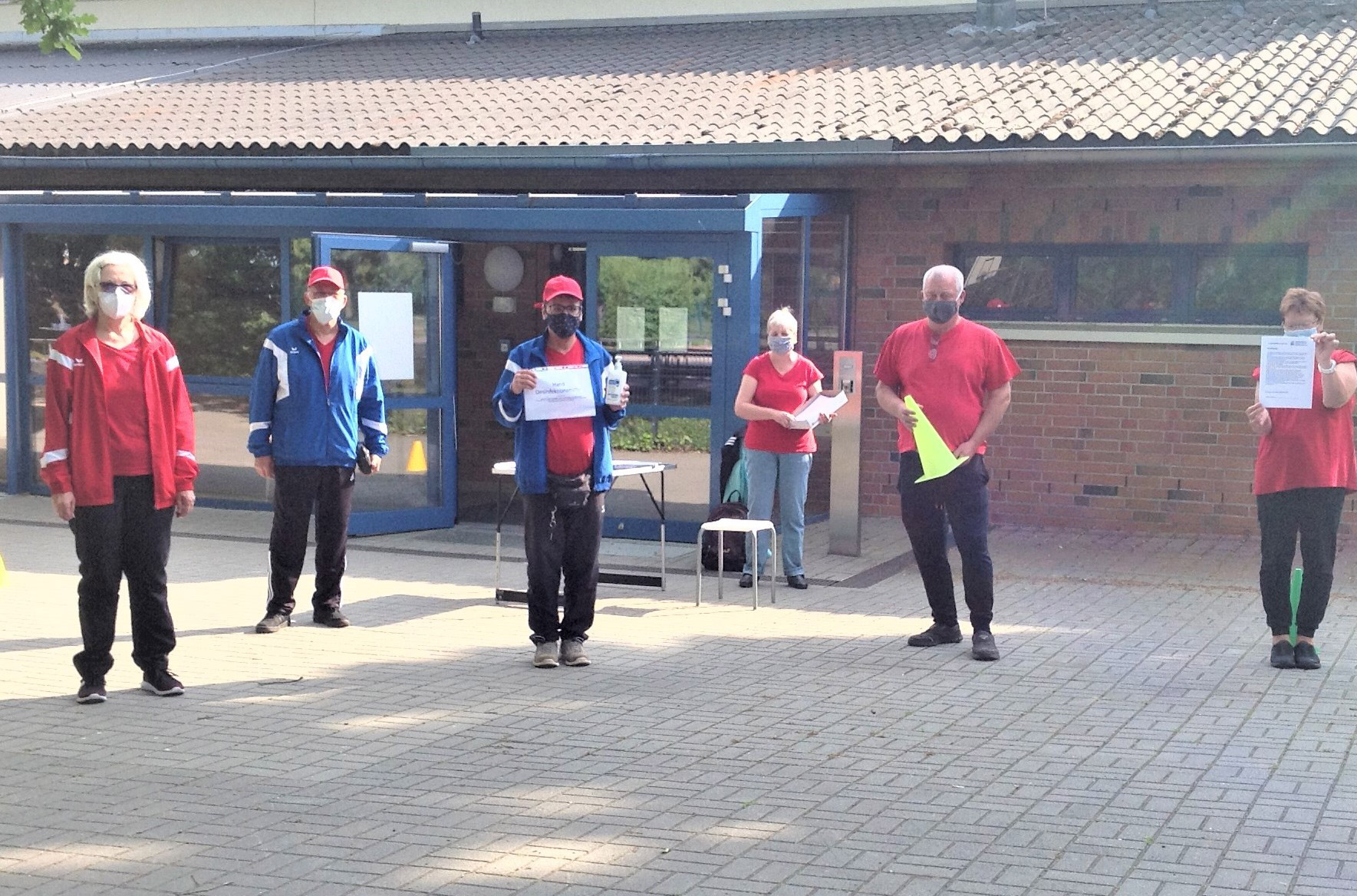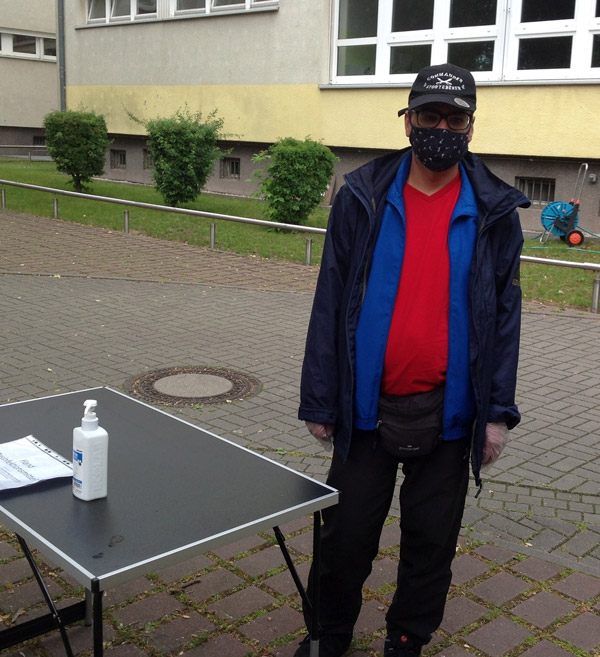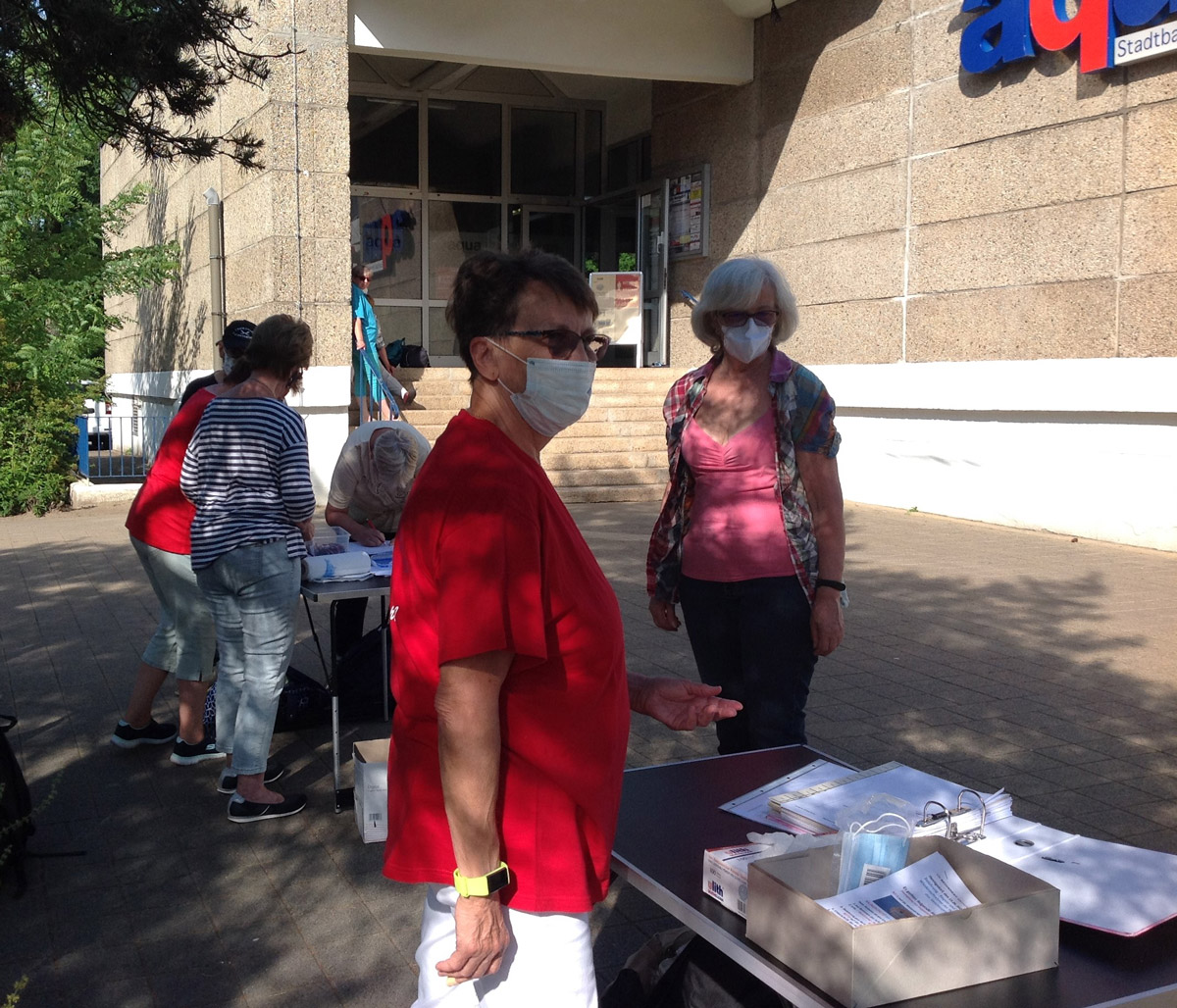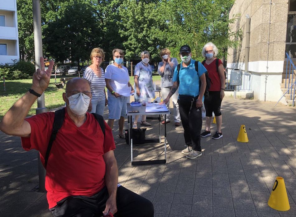 unsere Helfer vor das aqua Stadtbad und der Sporthalle (Grundschule Nord) in Hennigsdorf im Mai / Juni 2020